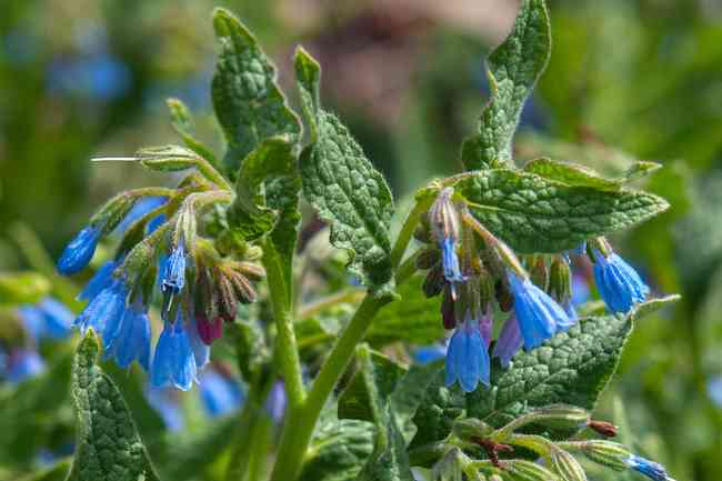 Deep-rooted comfrey can extract large quantities of nutrients from far below the soil’s surface,inaccessible to other plants.These nutrients are stored in the leaves.Gardeners can access these nutrients by harvesting the leaves and letting them break down to release a rich,dark,nutrient-rich plant food.